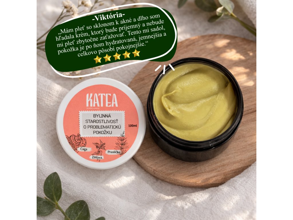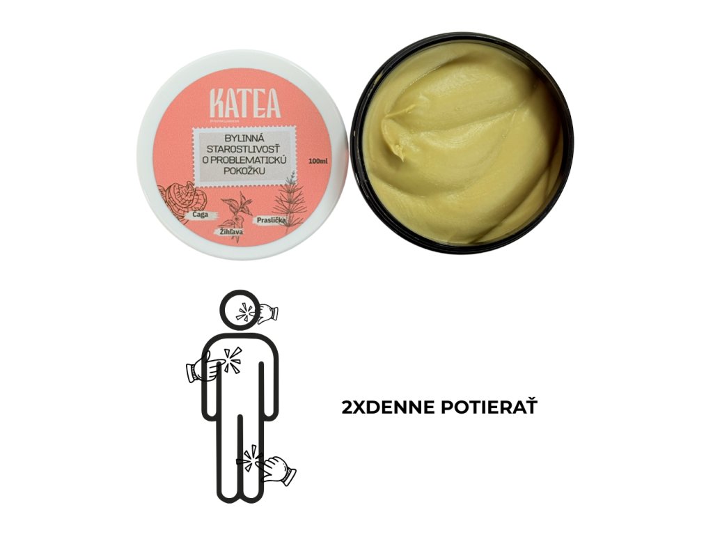Tento výživný bylinný krém je určený na každodennú starostlivosť o problematickú pokožku so sklonom k akné, ekzémom, psoriáze či zápalovým prejavom. Obsahuje výťažky z čagy, prasličky a žihľavy, ktoré sú známe svojimi regeneračnými a čistiacimi účinkami. Čaga podporuje hojenie, upokojuje podráždenie a pomáha obnoviť rovnováhu pokožky. Praslička, bohatá na kremík, posilňuje kožné tkanivo a podporuje regeneráciu, zatiaľ čo žihľava účinne čistí, reguluje tvorbu mazu . Vďaka kombinácii bylín, zvláčňujúcich masiel, aloe vera, panthenolu a esenciálnych olejov krém hĺbkovo hydratuje, zjemňuje a posilňuje ochrannú bariéru pokožky. Je vhodný na tvár aj telo, pre citlivú, podráždenú, suchú aj mastnejšiu pleť.